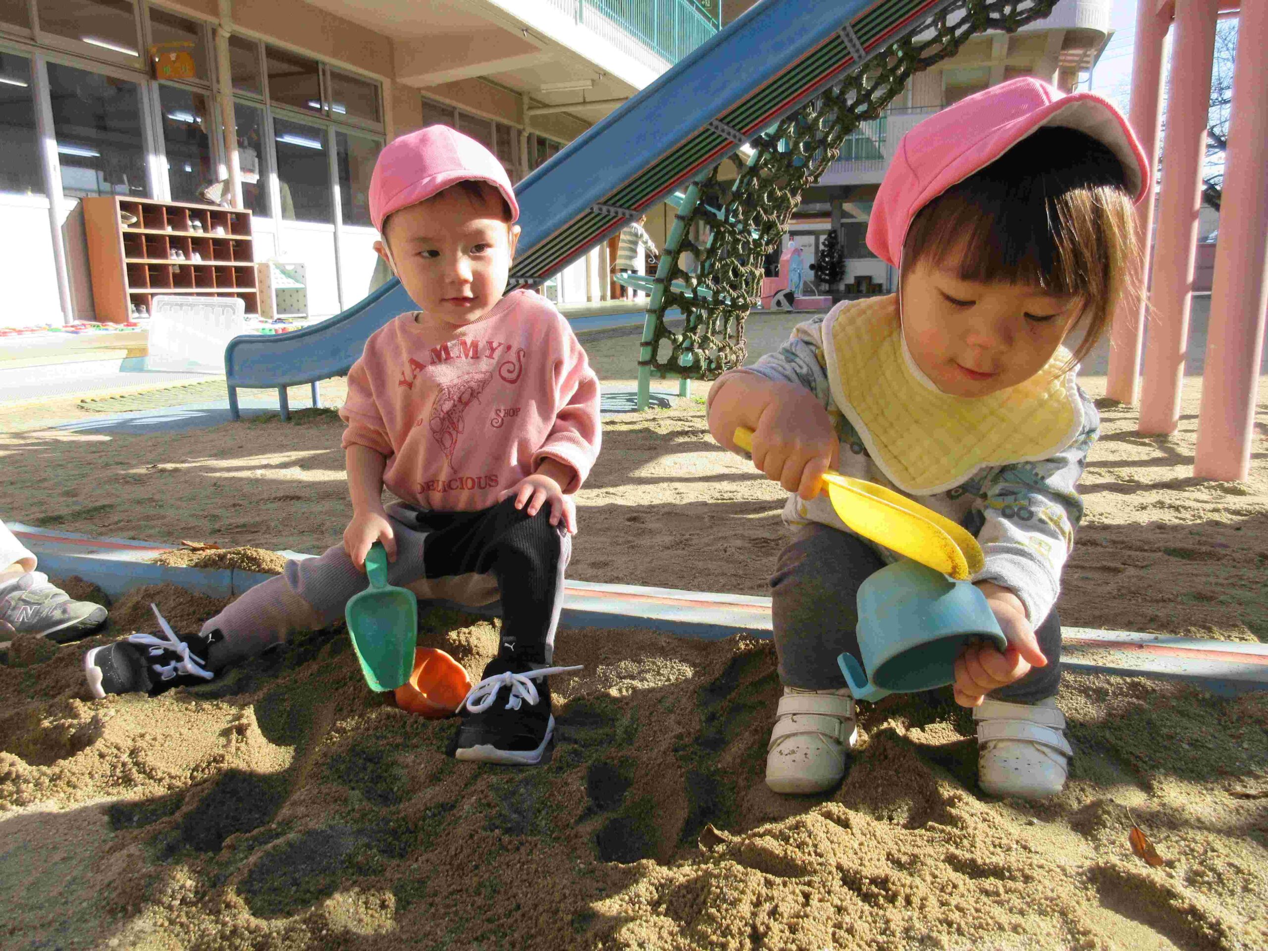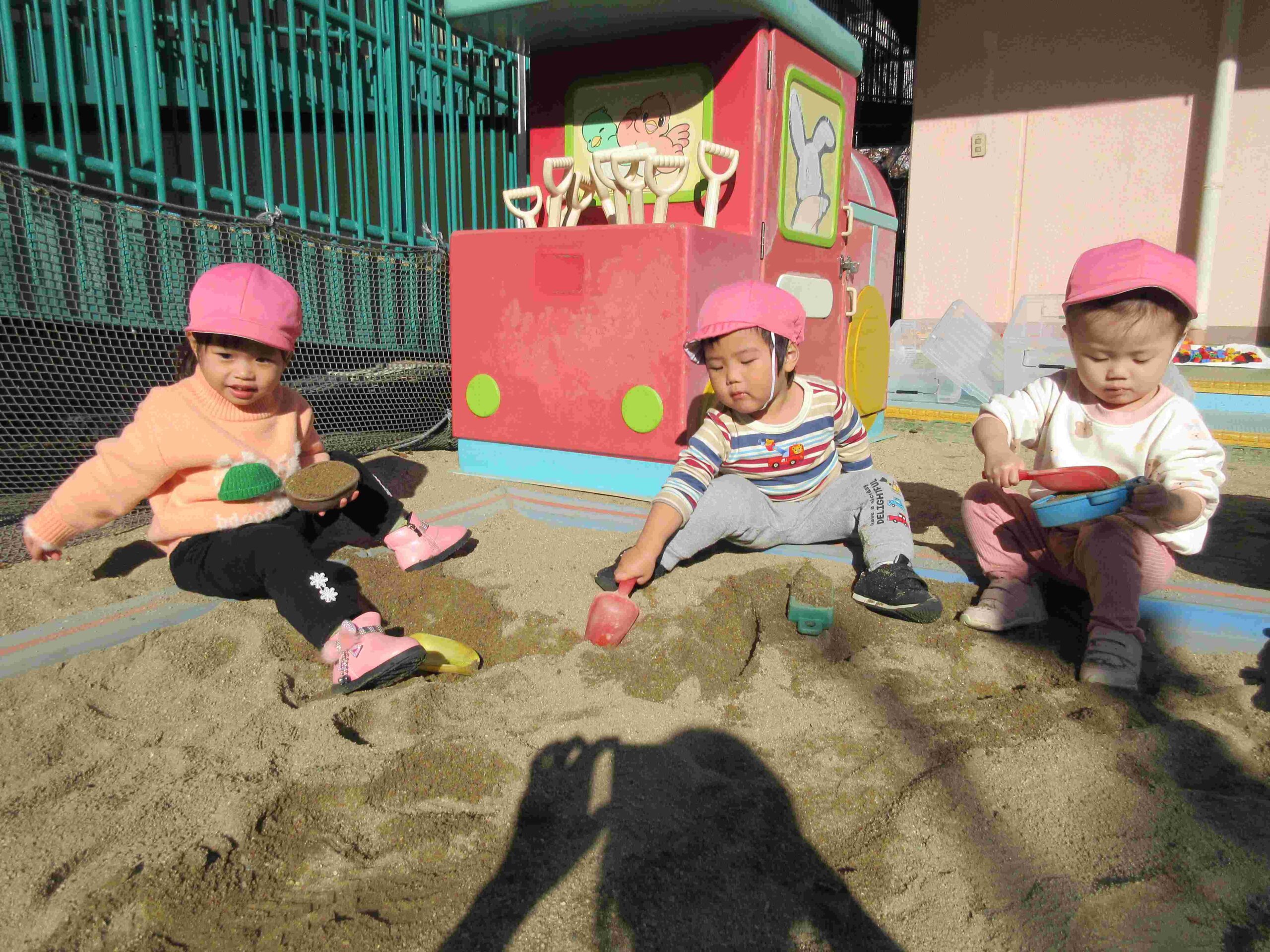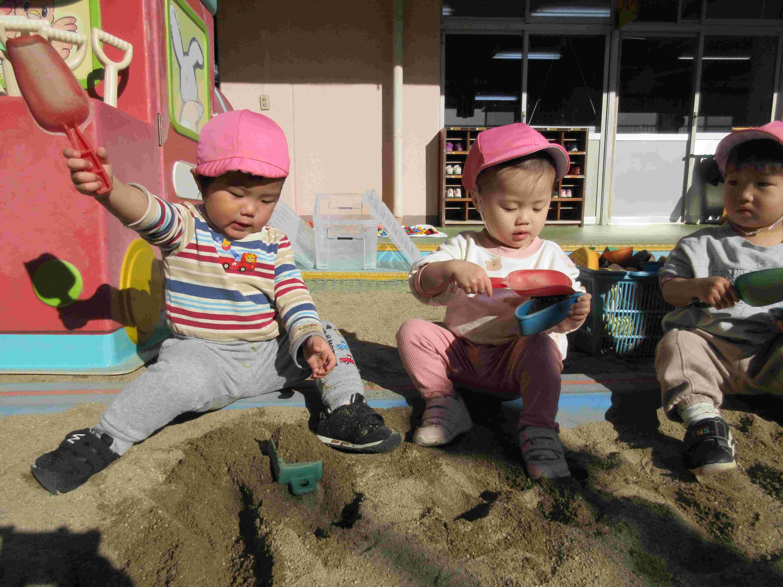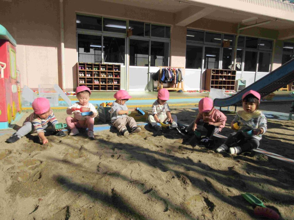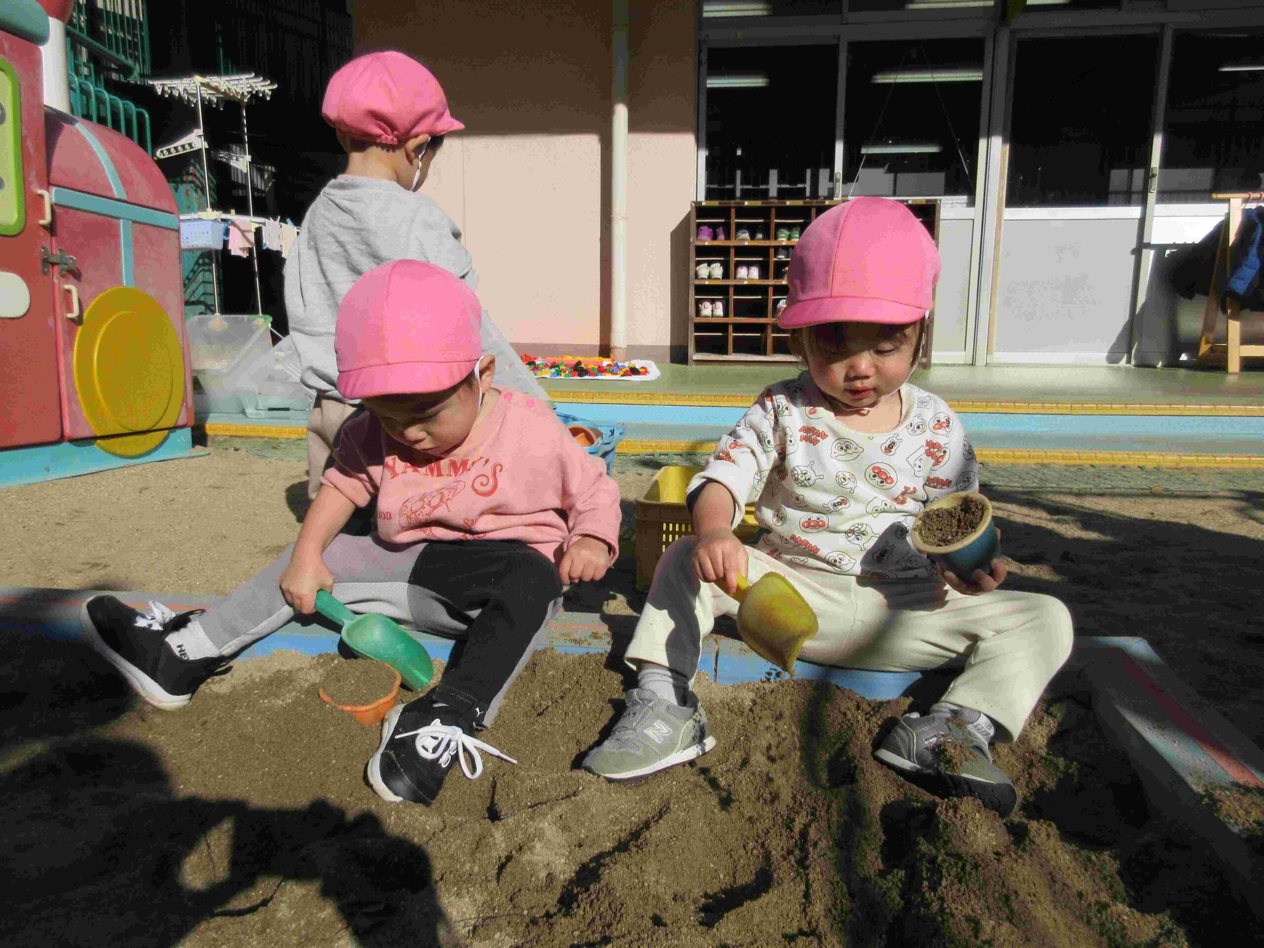 砂場で遊びました。砂を入れたり落としたり、型抜きも上手にできるようになってきました。