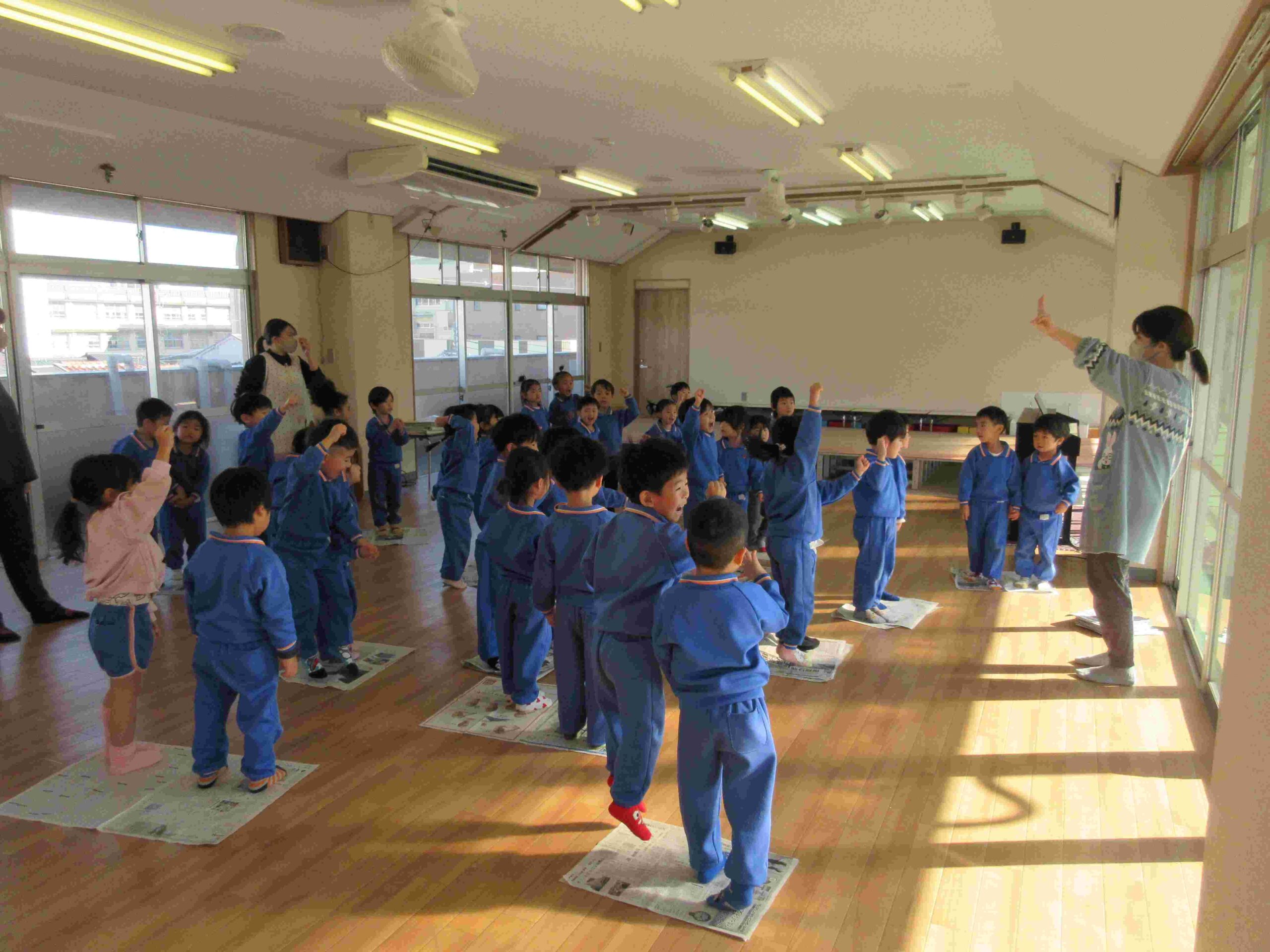新聞じゃんけんでは小さくなった新聞から落ちないよう手を繋いだり、お互いに体を支え合ったり、ほほえましい姿が見れました♬