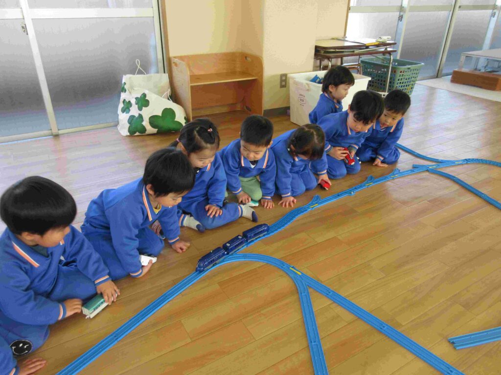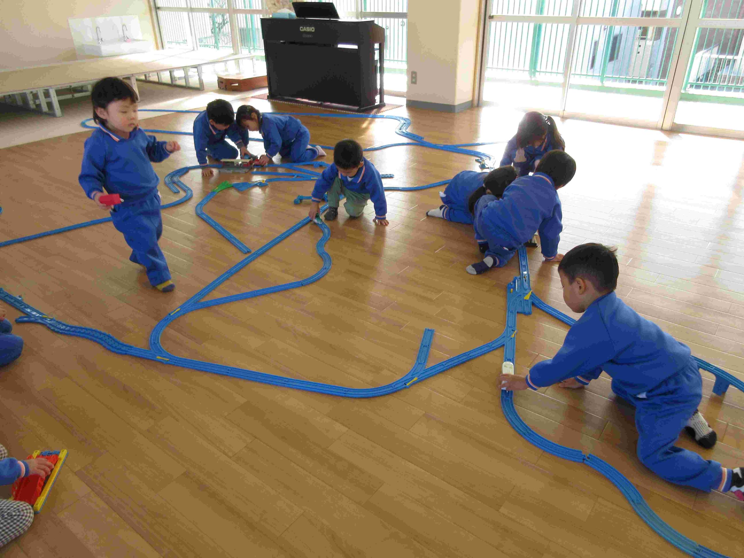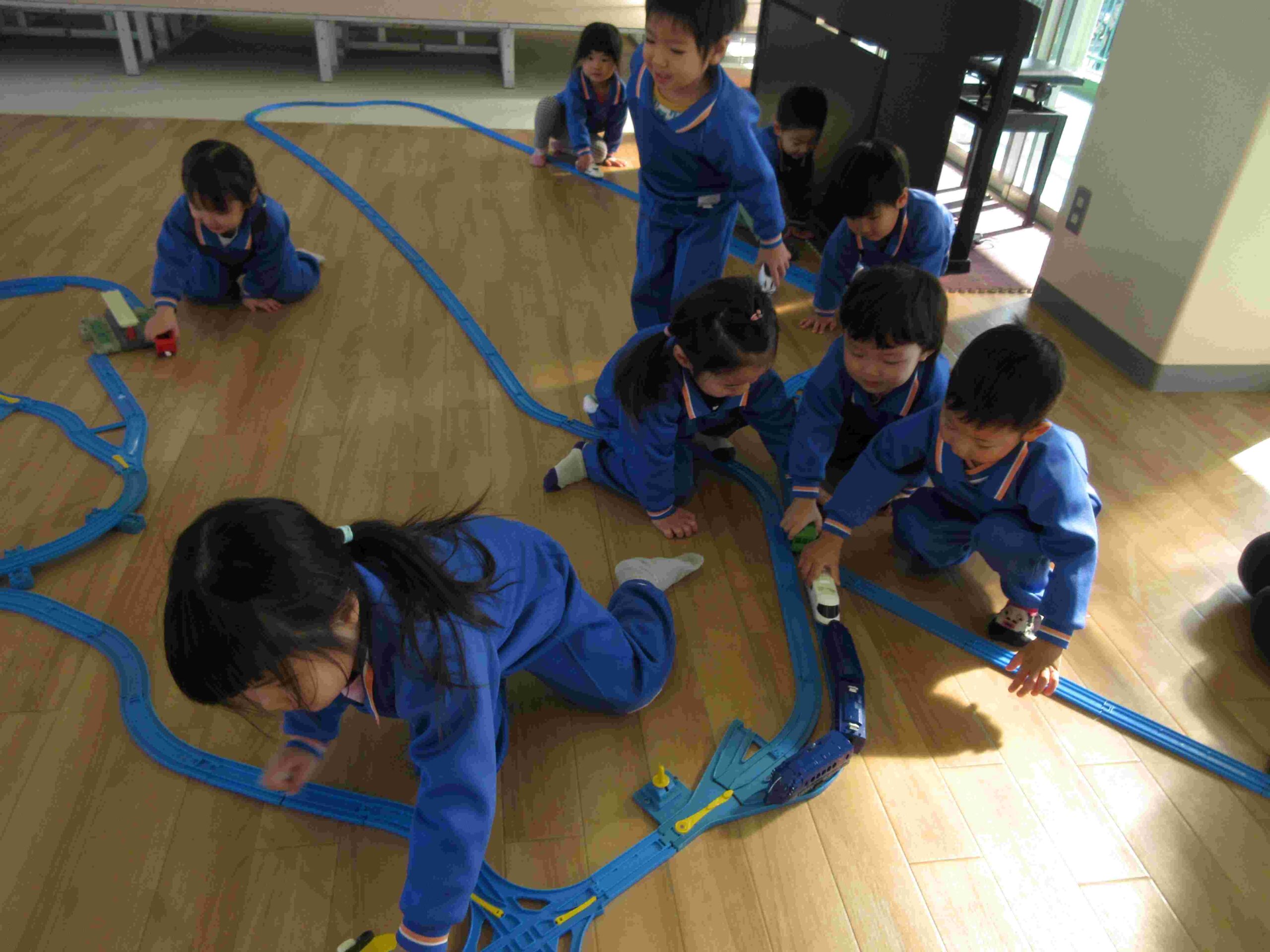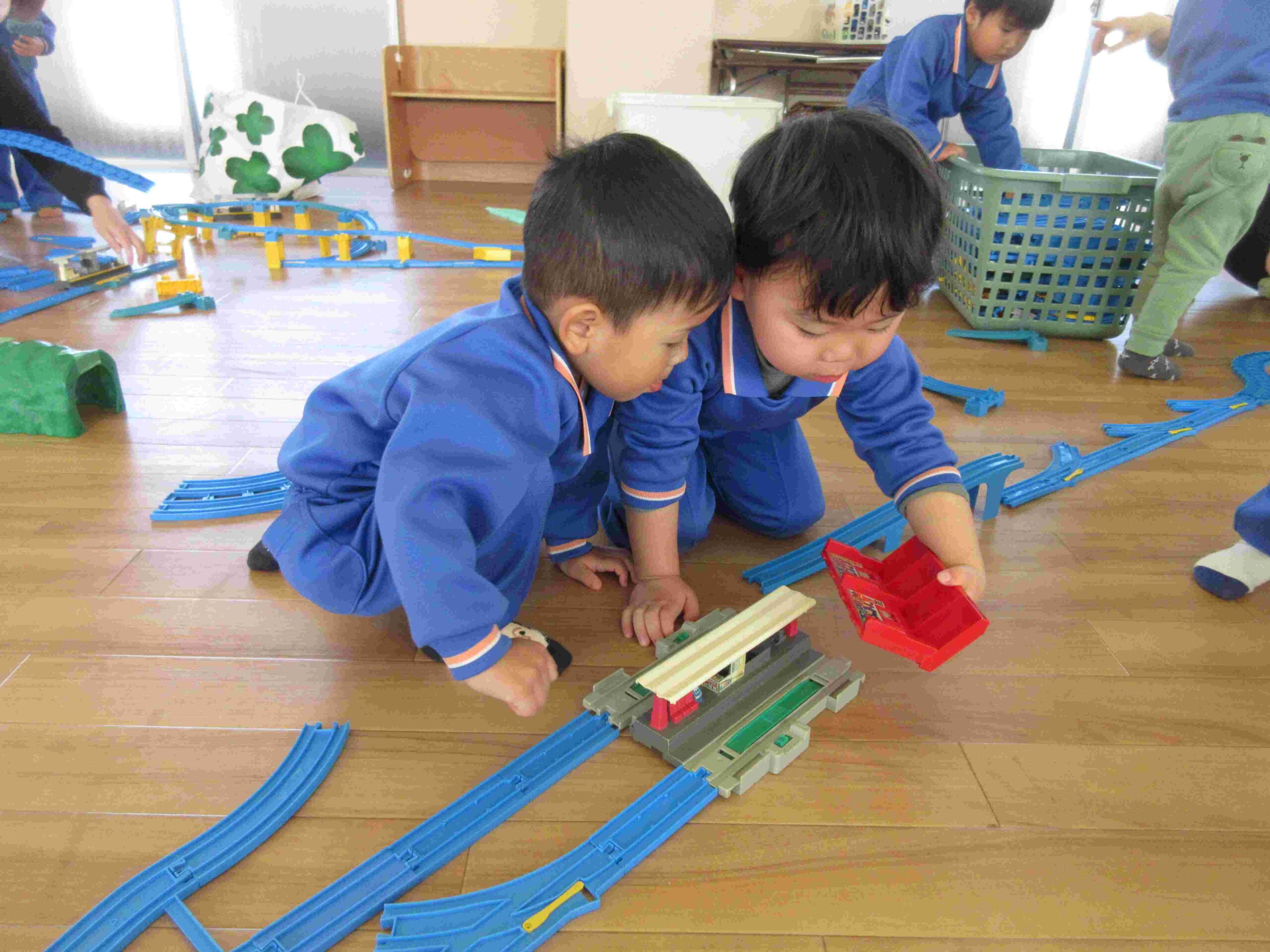 ・今日はプラレールをして遊びました。みんなで協力して線路を作り電車を走らせました。