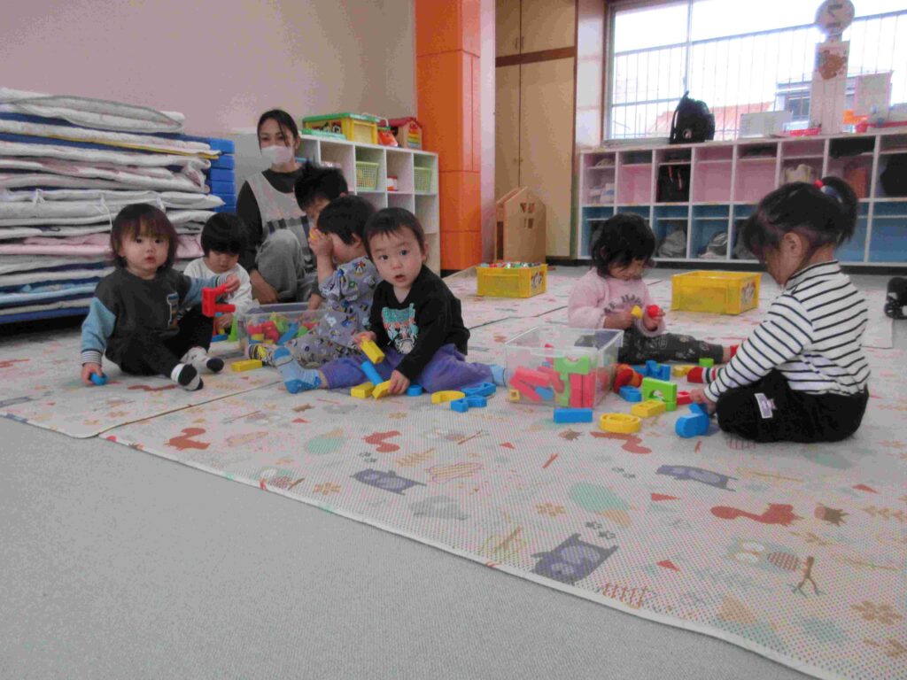・つなげたり、積んだり、一人ひとりが思い思いのものを作っていました。「できた」「みて」と作ったものを嬉しそうに教えてくれました。